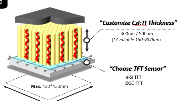 | Process | CsI directly deposited on TFT | CsI on substrate → bonded to TFT | Gadox sheet laminated | Special Processing Technology |