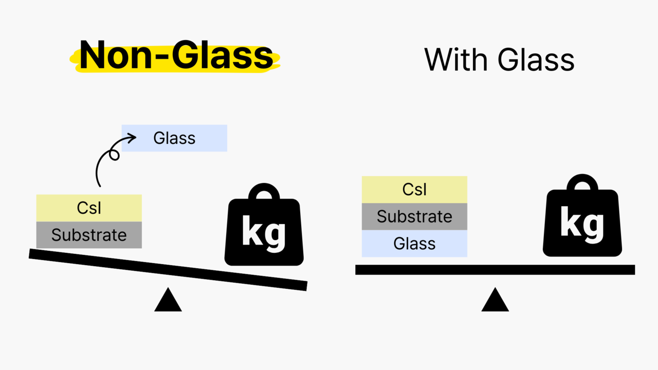 Conventional CsI Scintillators use glass-based TFT panels, which add weight and introduce vunerability to impact. Our non-glass technology offers two key advantages :